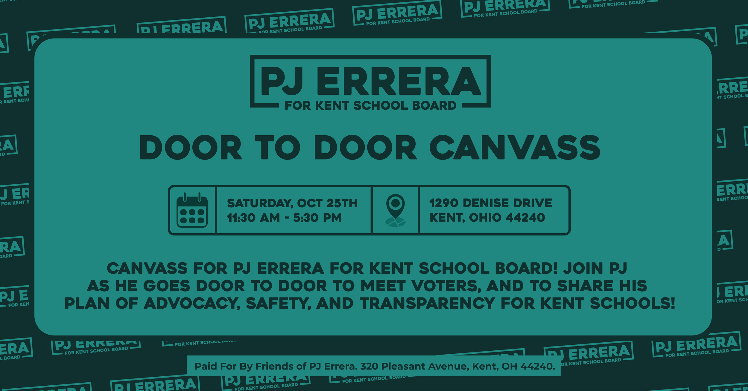 Canvass for PJ Errera for Kent School Board! Join PJ and volunteers across the district as we go door to door to share his plan of Advocacy, Safety, and Transparency for Kent Schools! Multiple Shifts Available!